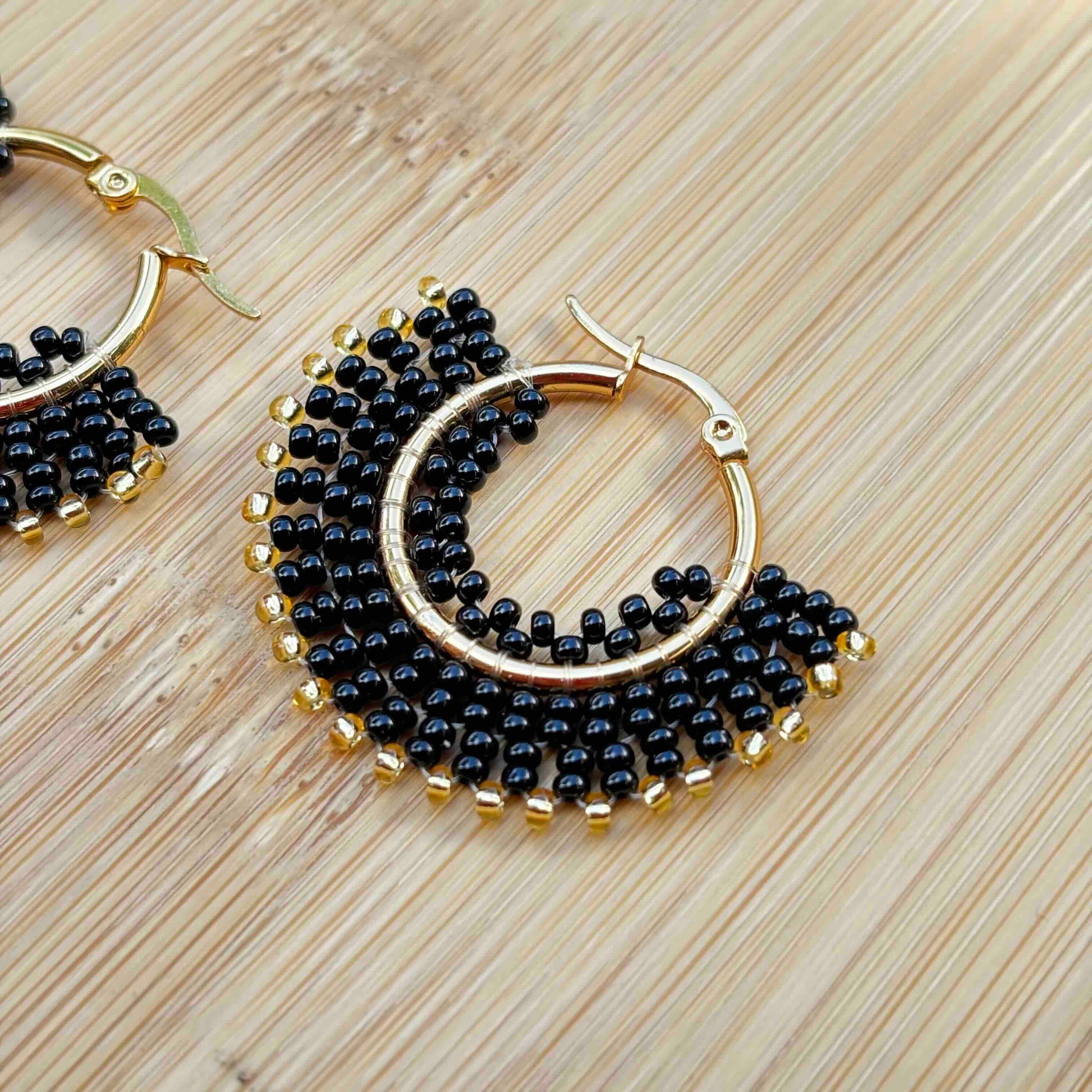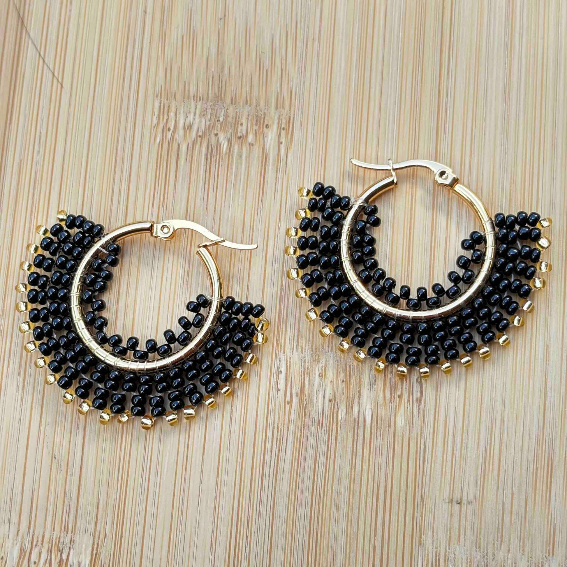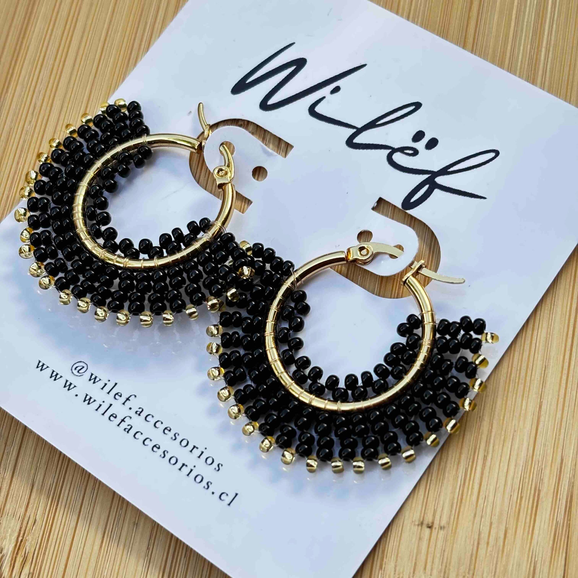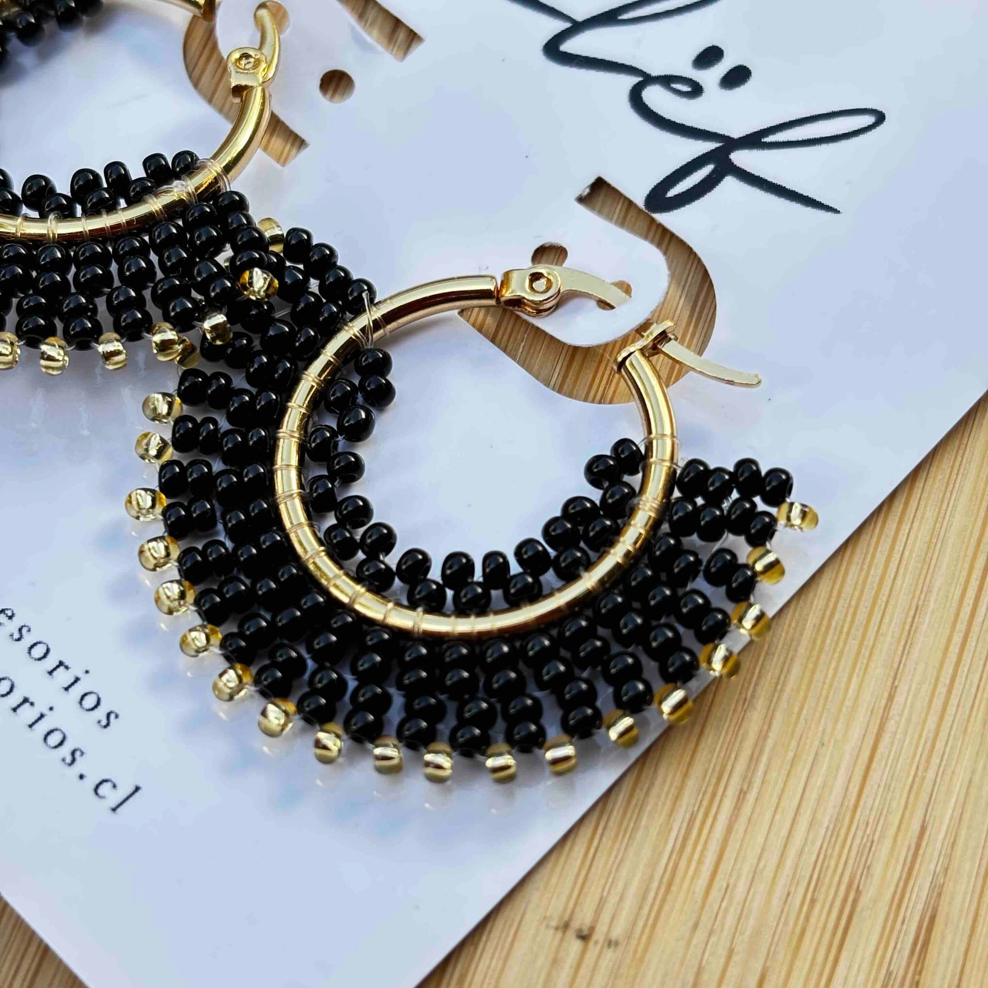 Aros Argolla Tejidos a Mano con Mostacillas | Negros Dorados
