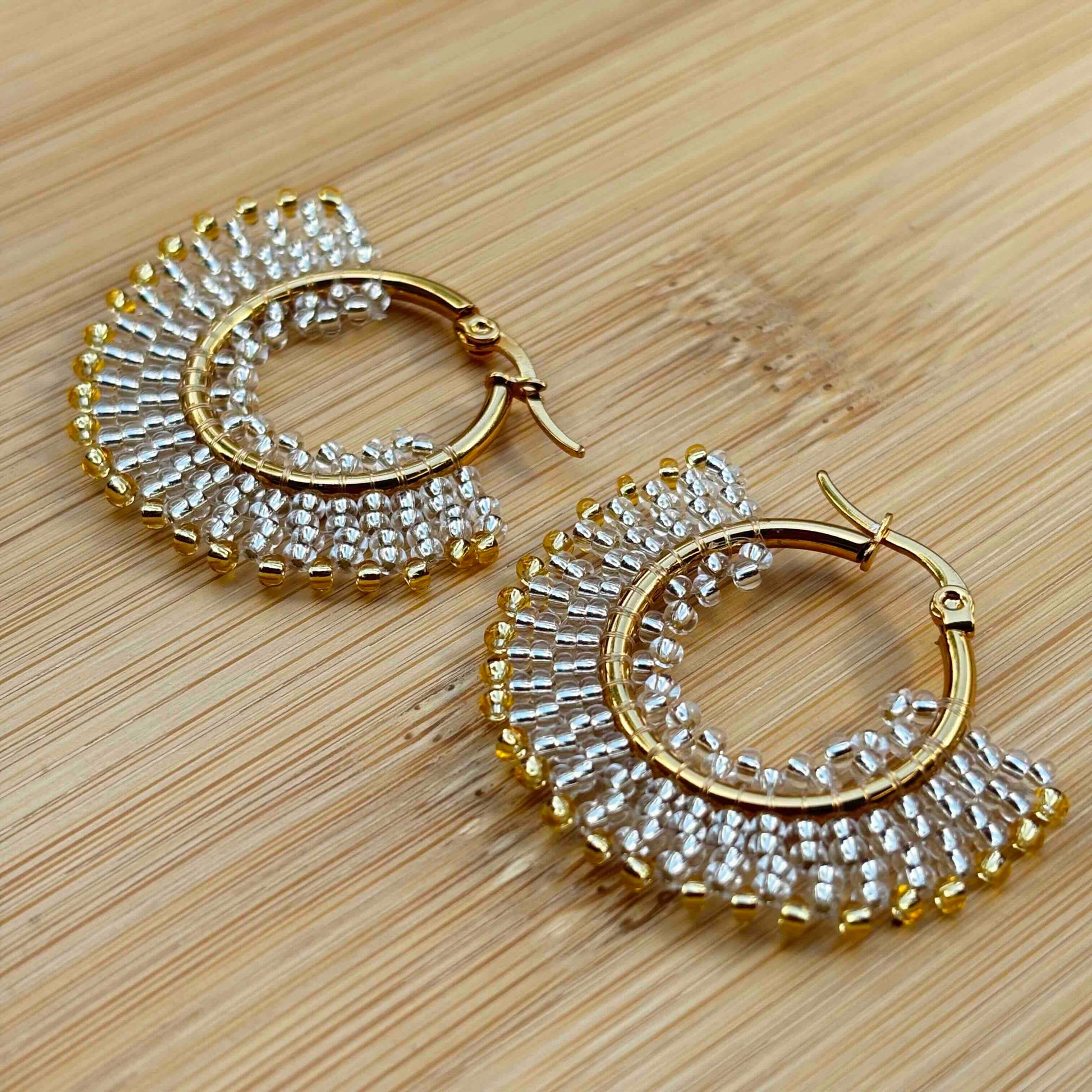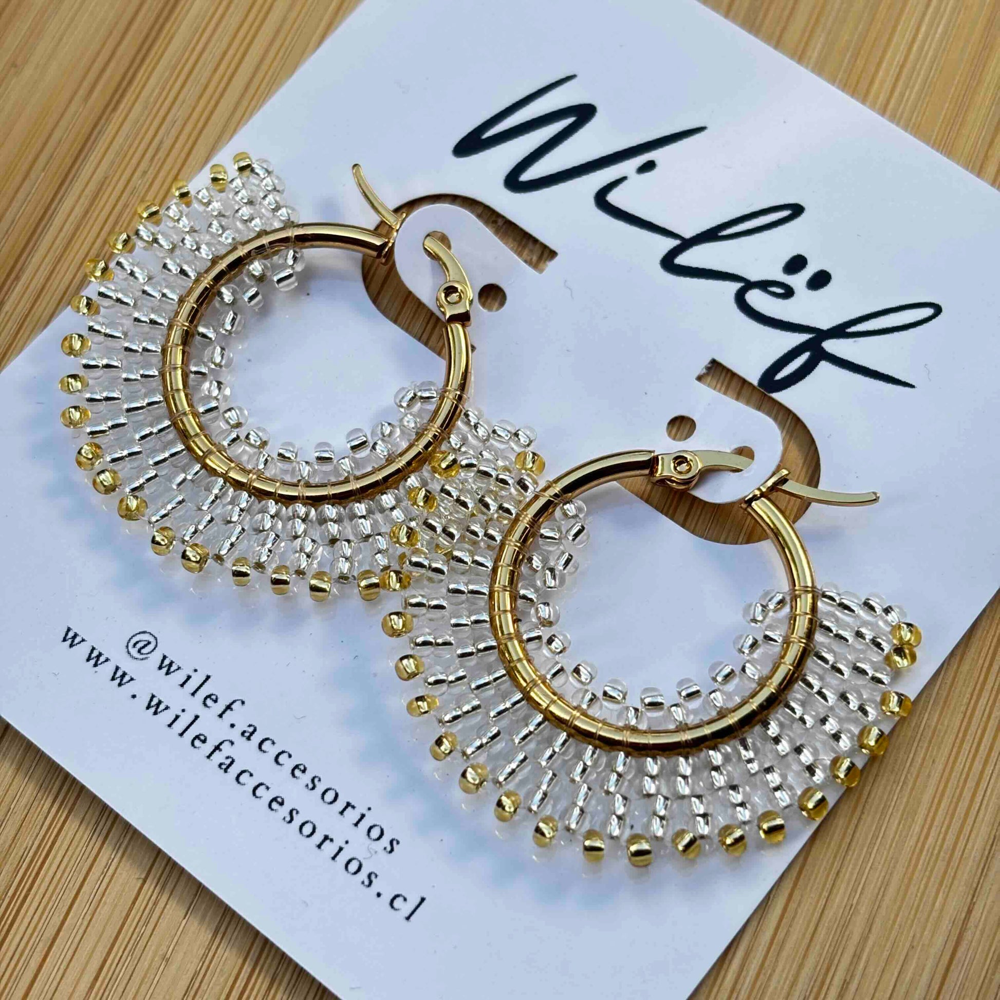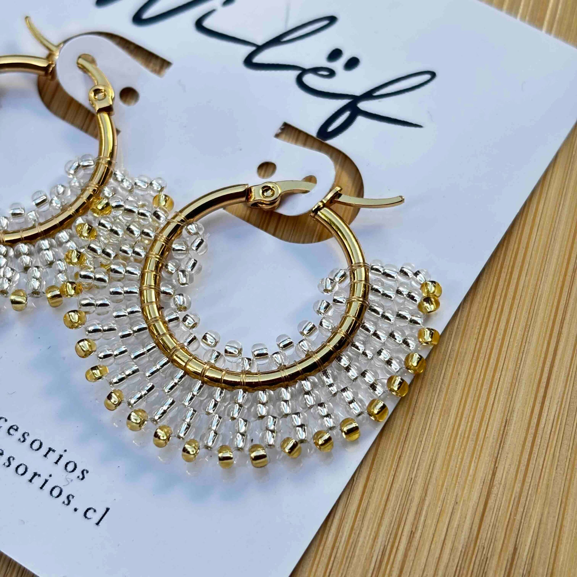Aros Argolla Tejidos a Mano con Mostacillas | Gris Dorados