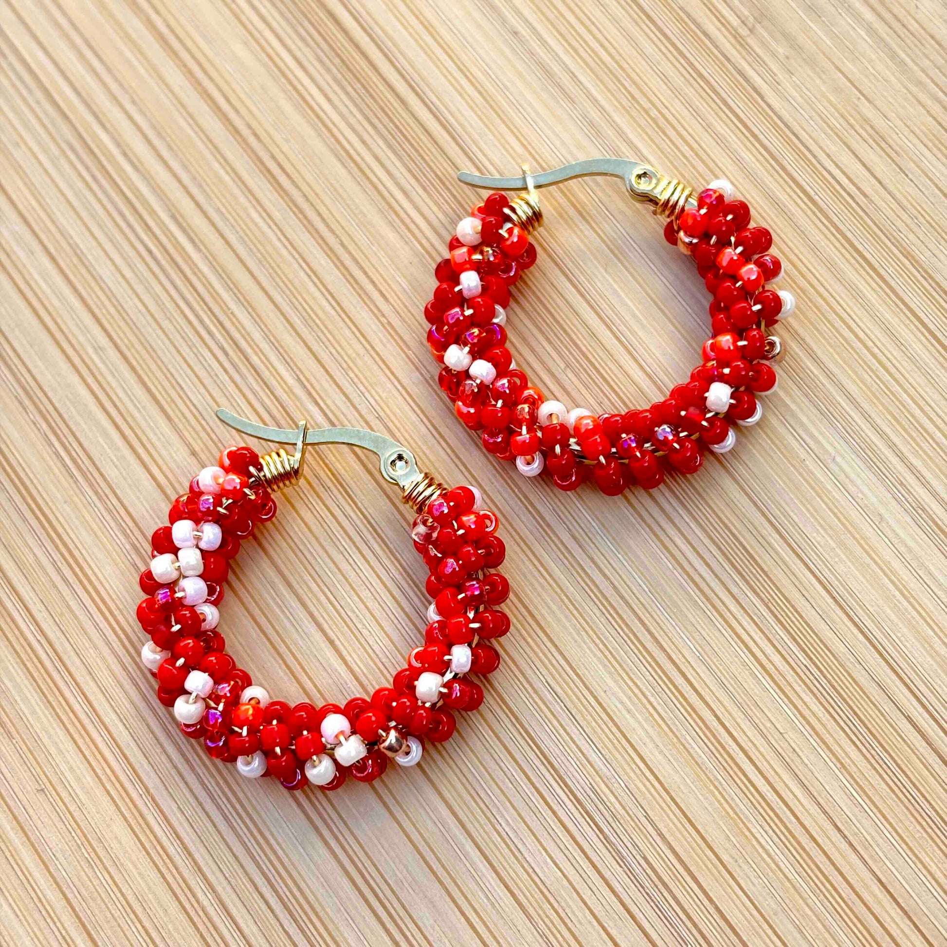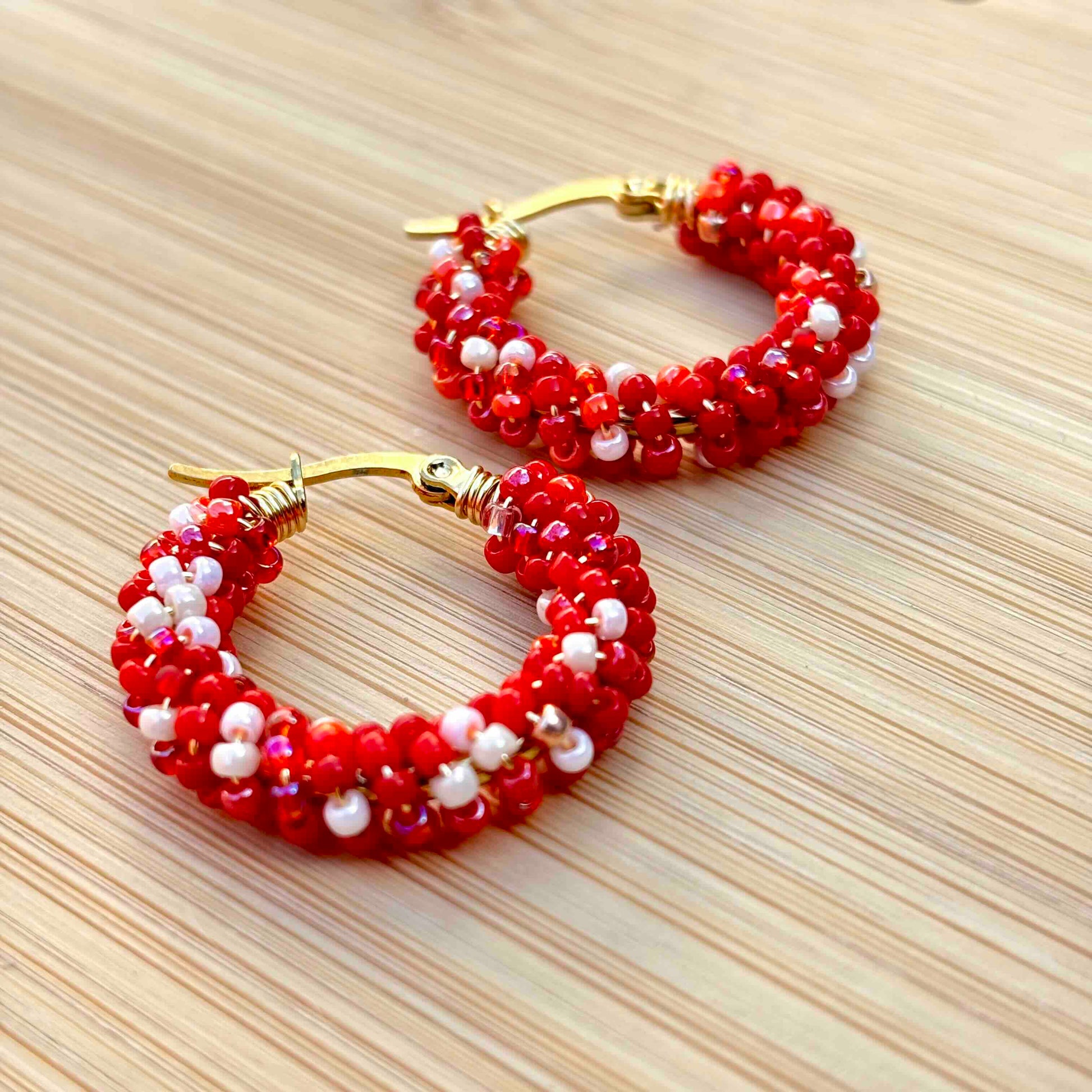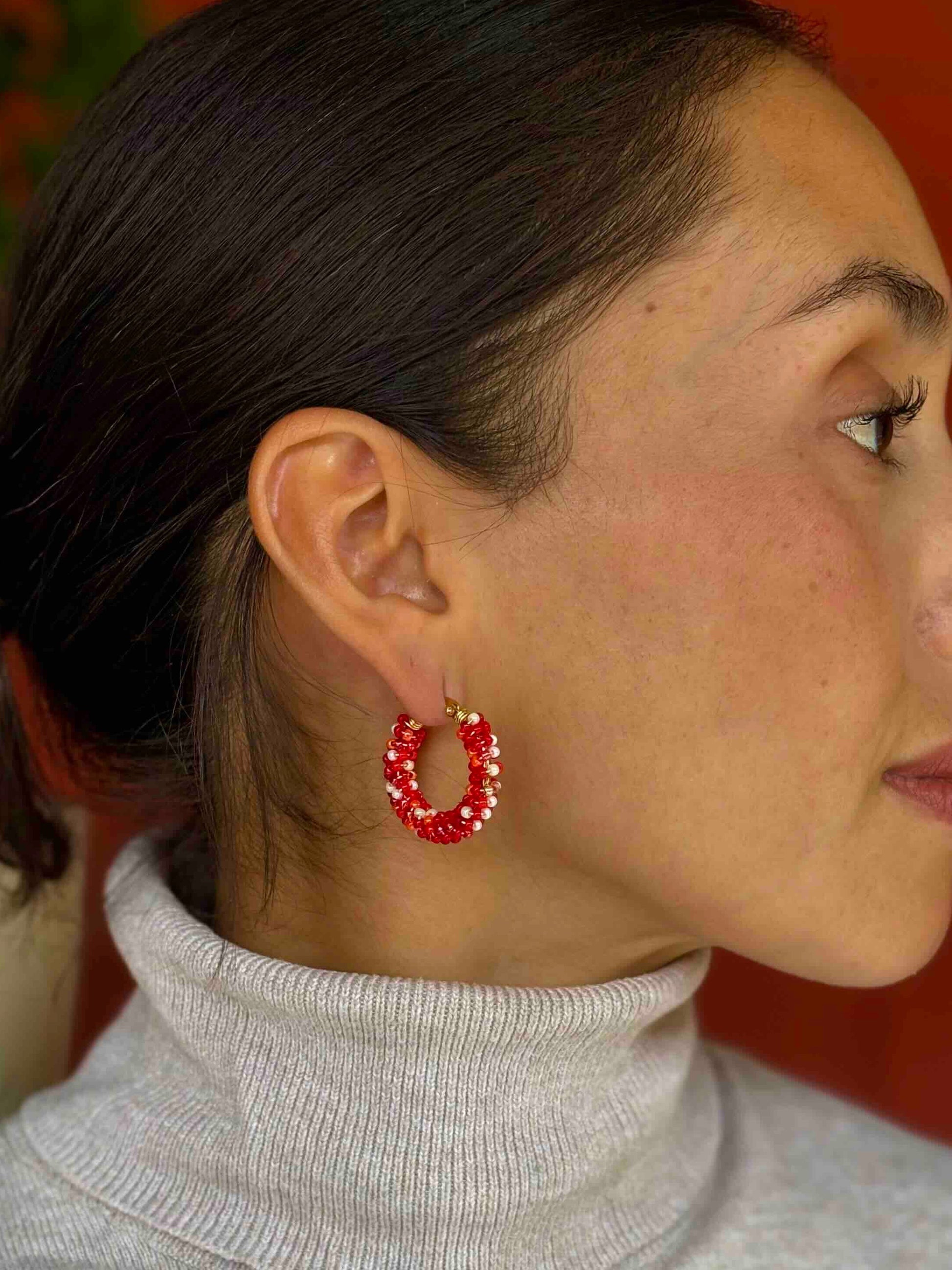 Aros Argolla Tejidos a Mano con Mostacillas – Diseño Artesanal, Mix Rojos