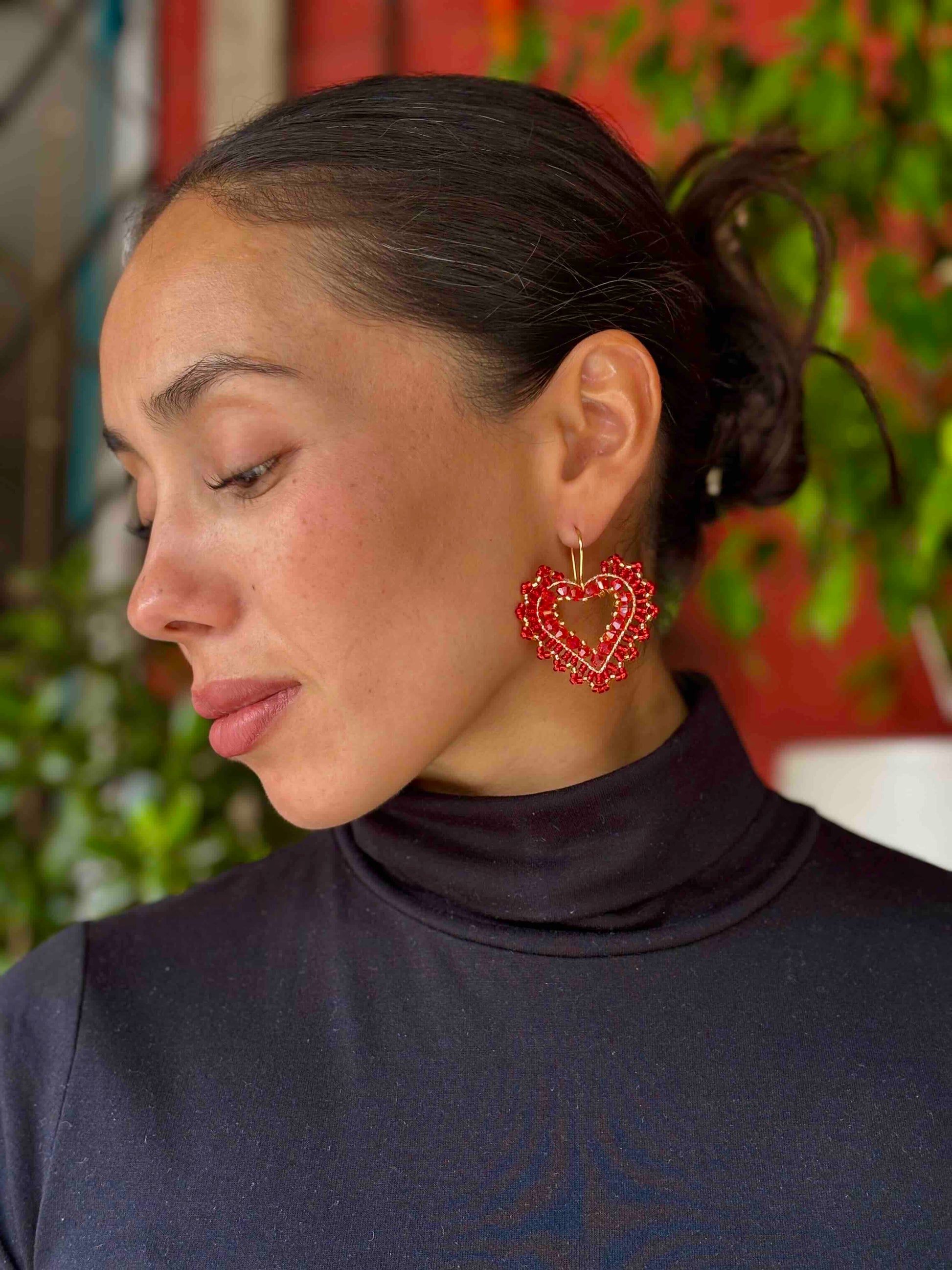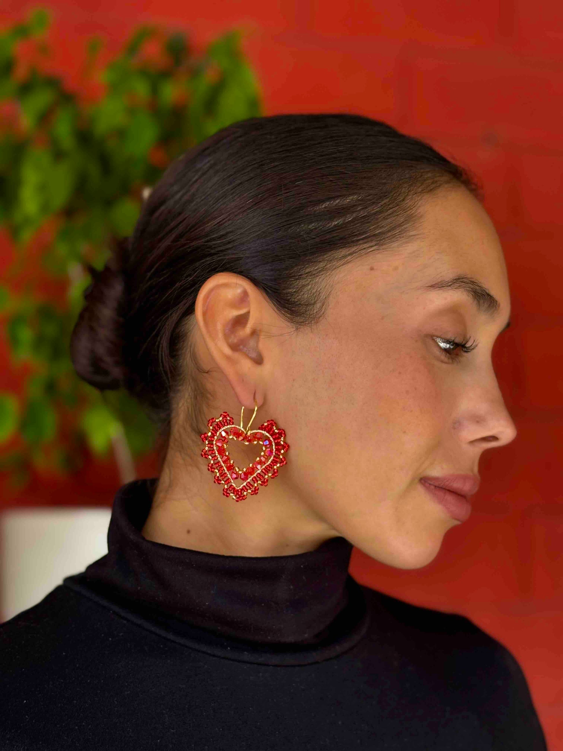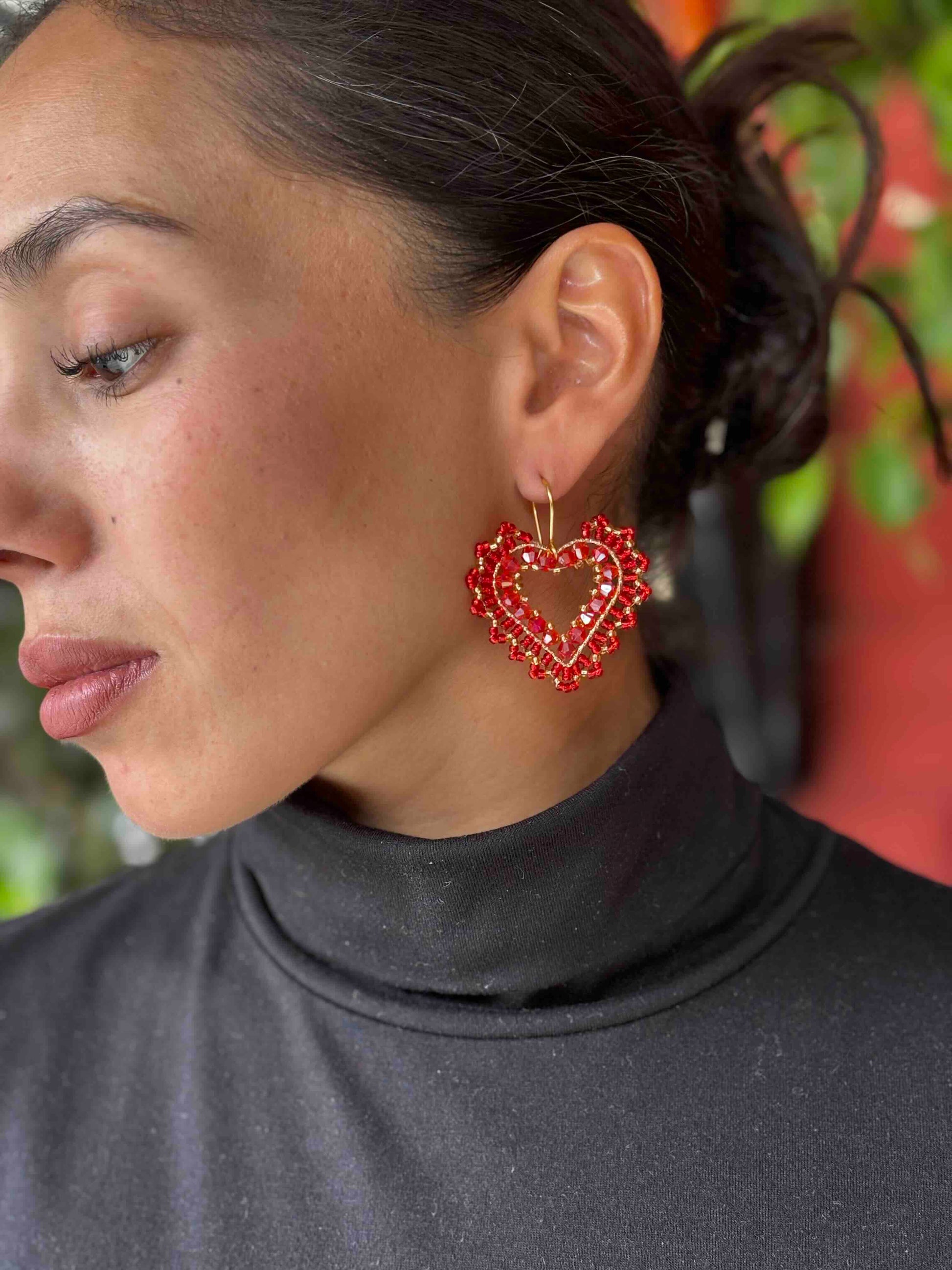 Aros Corazón Tejidos a Mano con Cristales – Diseño Romántico en Tonos Rojos y Dorado