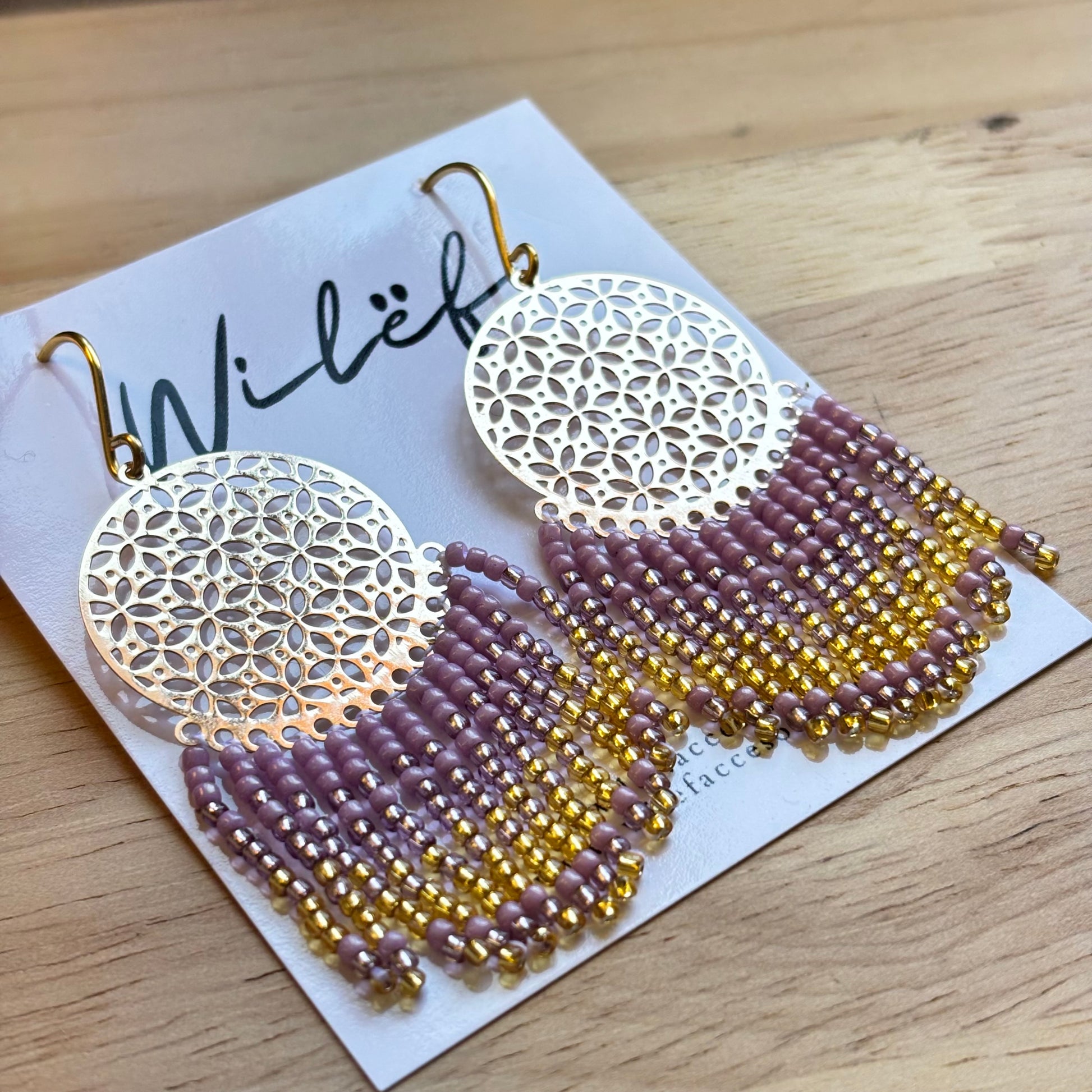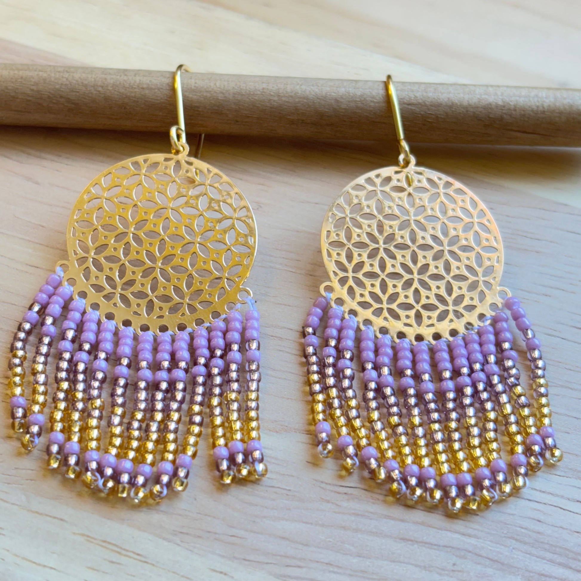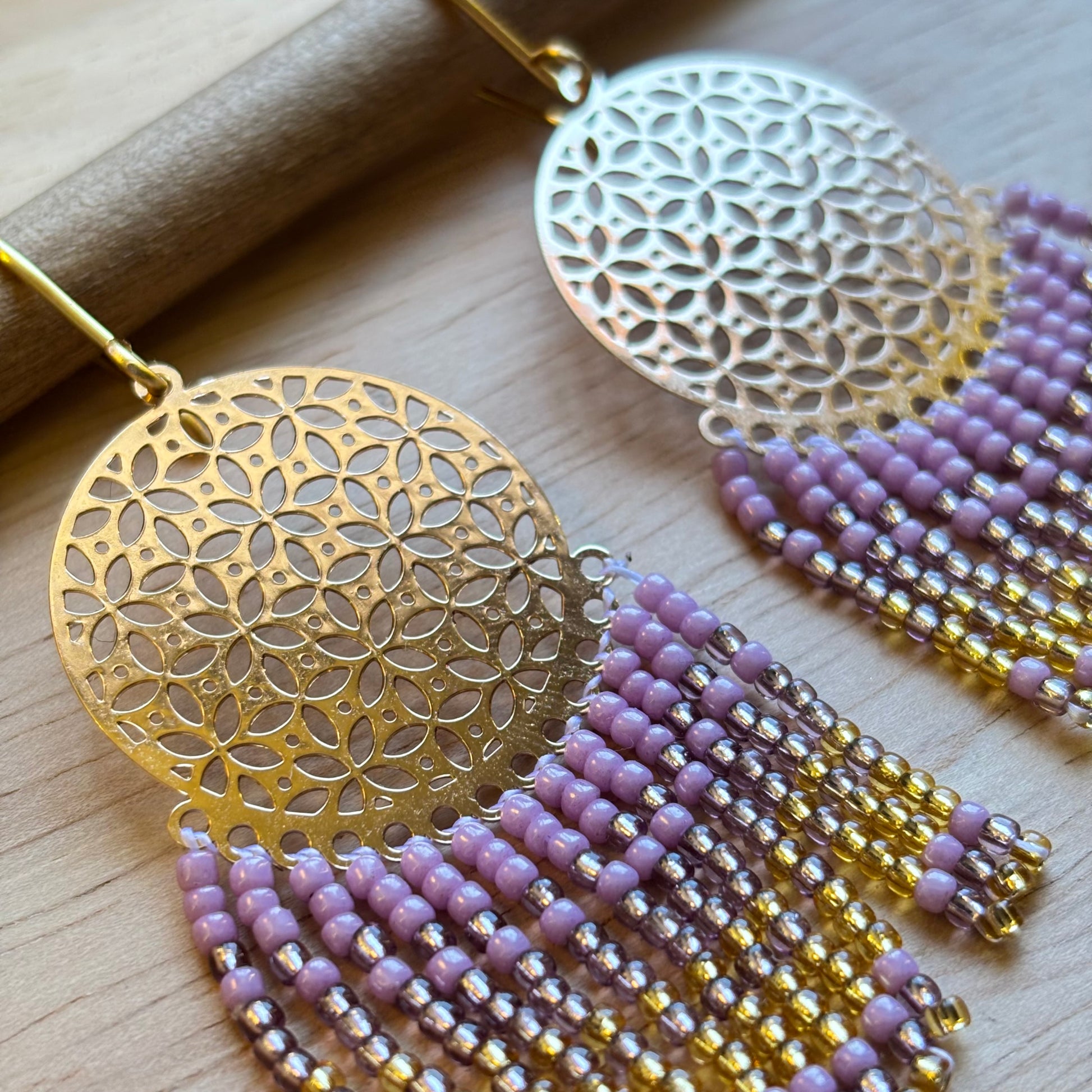 Aros largos con mostacillas – Color Lila y dorado - Diseño Cascada Mandala