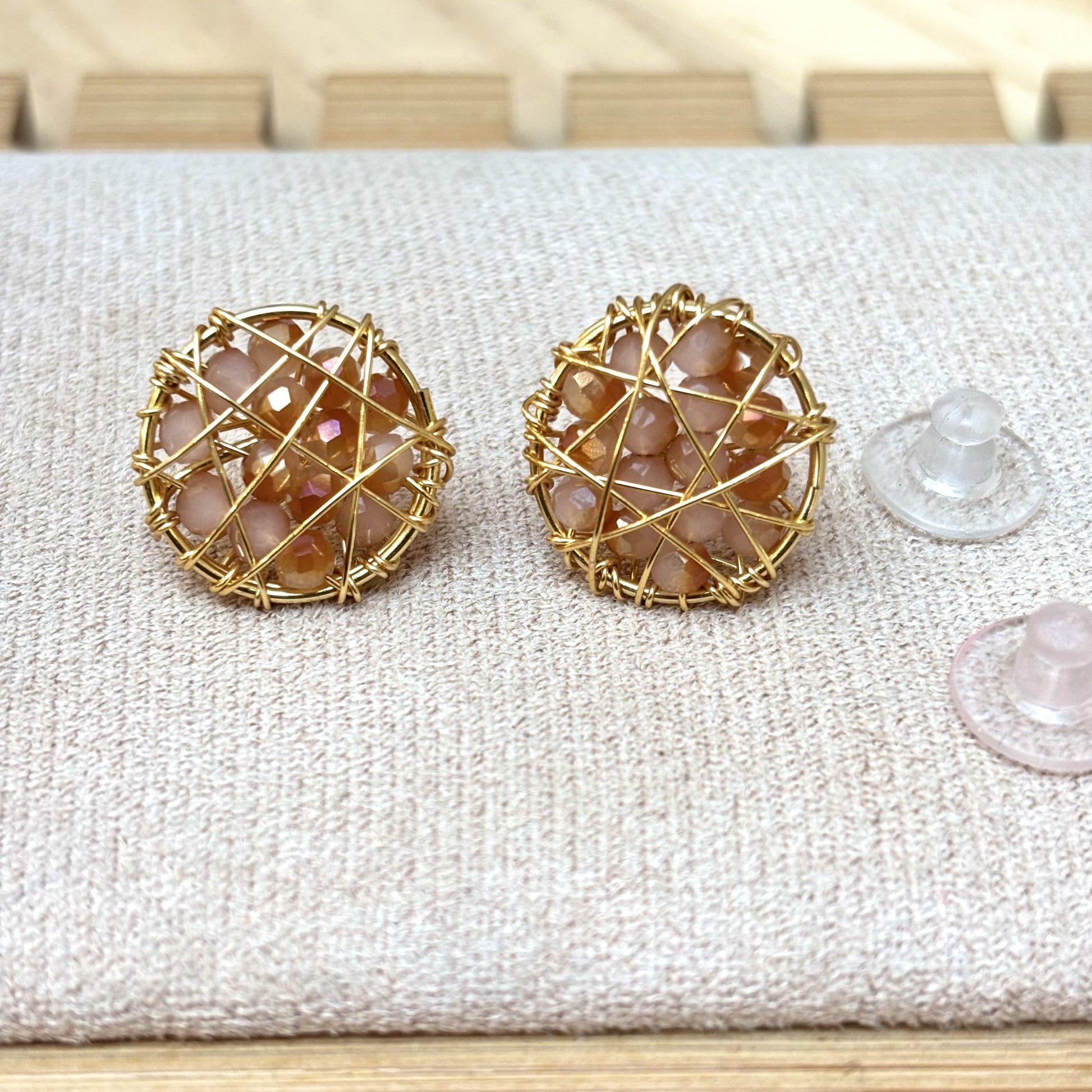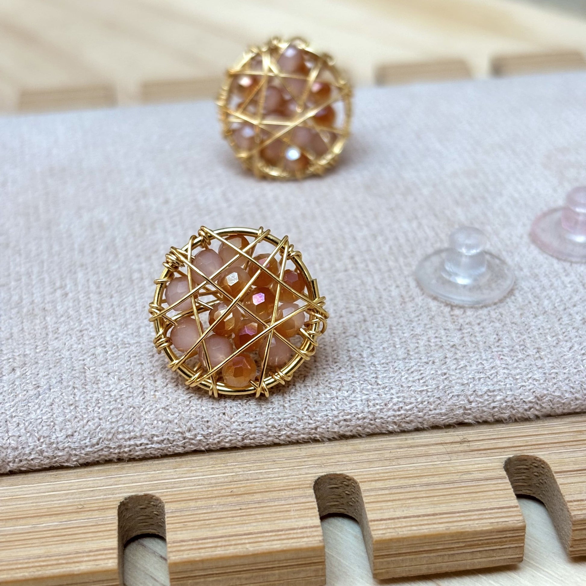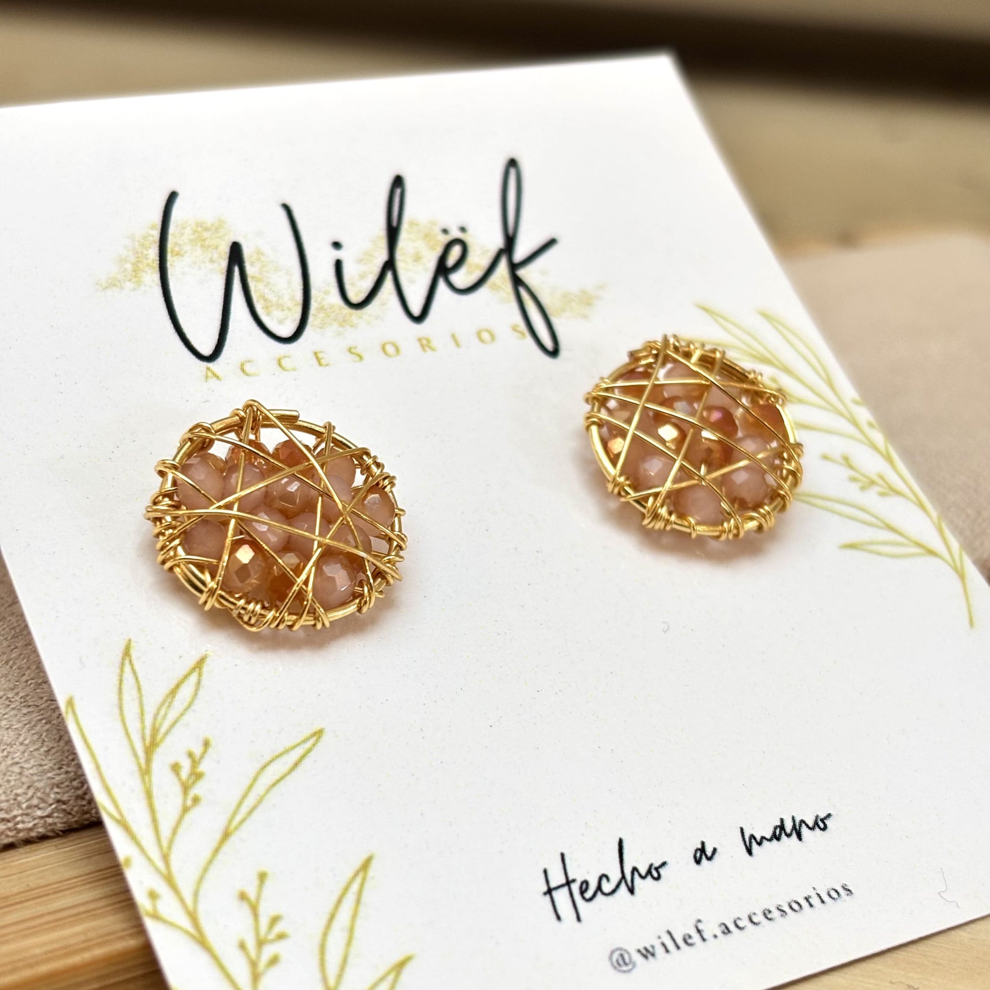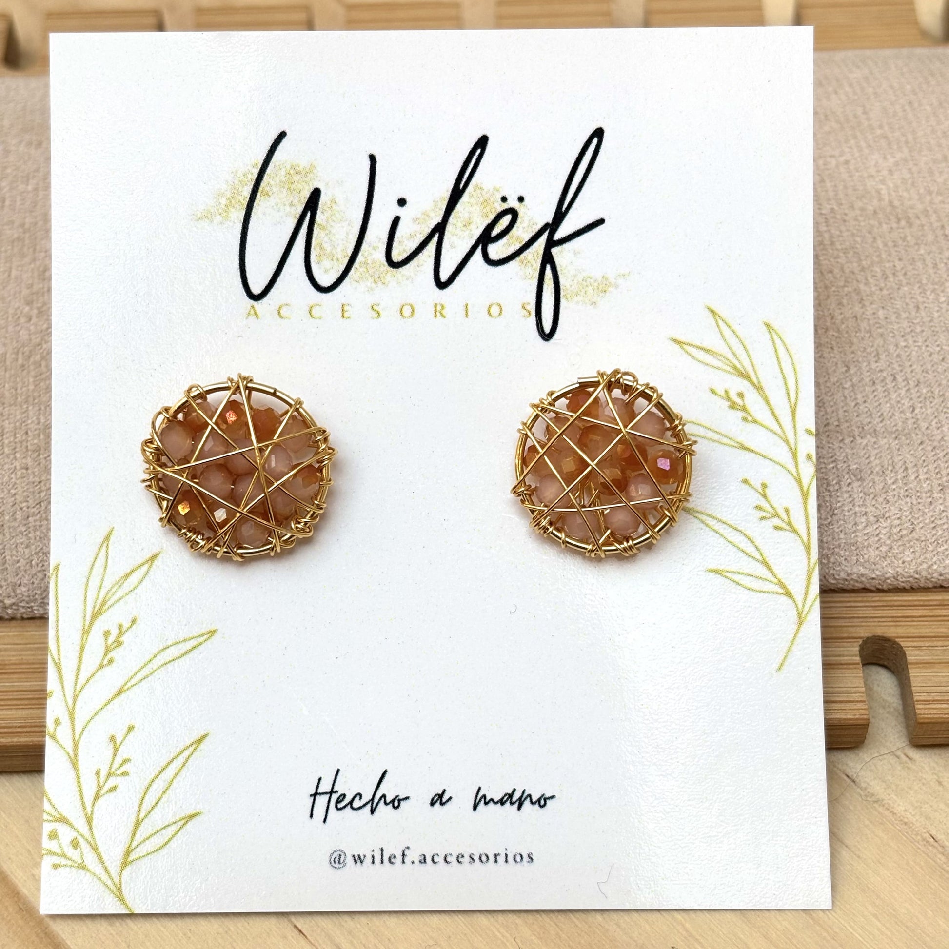 Eleva tu estilo con estos delicados Aros circulares pequeños en tonos Ambar y dorado, creados a mano con cristales facetados que reflejan la luz con cada movimiento. Su diseño artesanal, envuelto en finos hilos dorados, logra un equilibrio perfecto entre elegancia y modernidad.