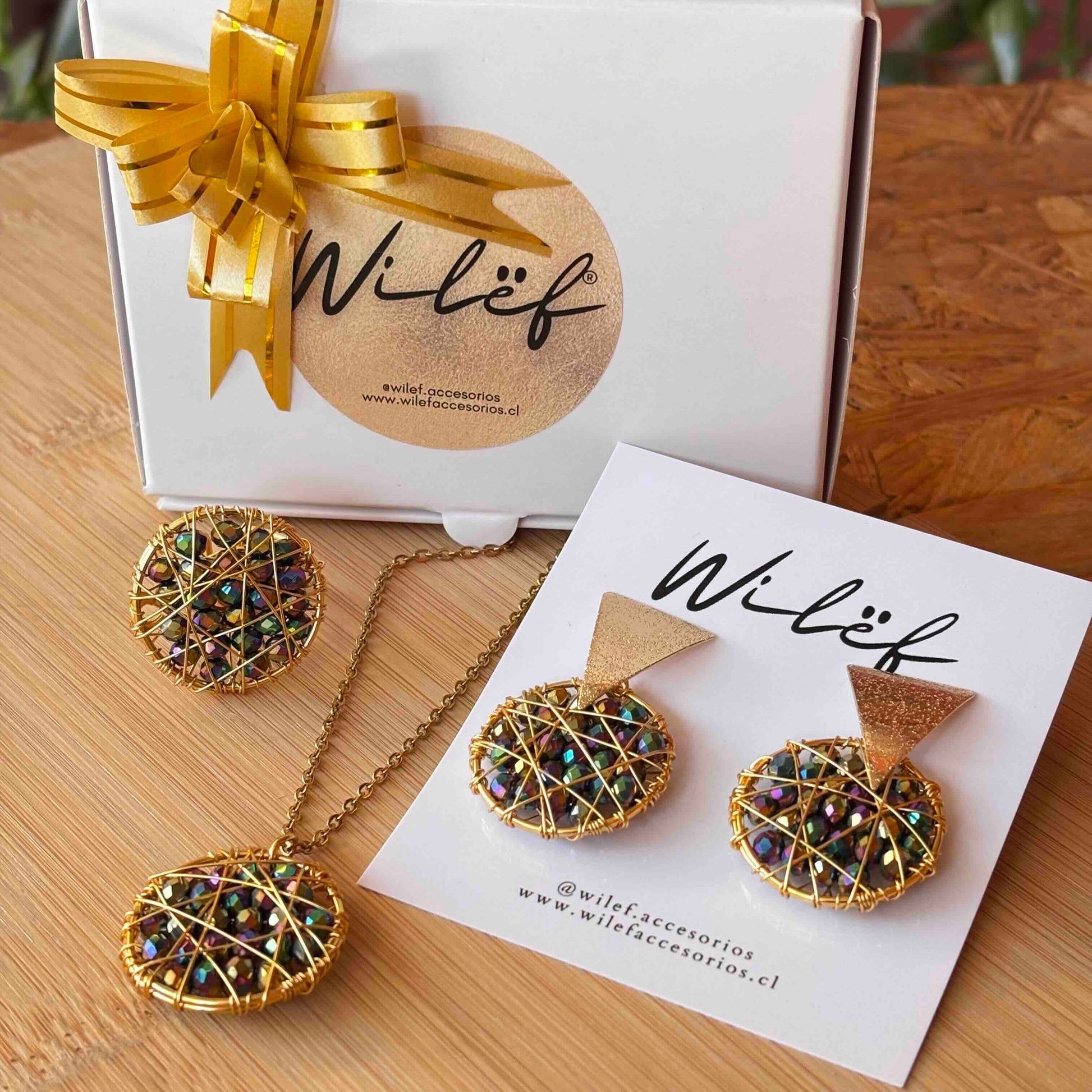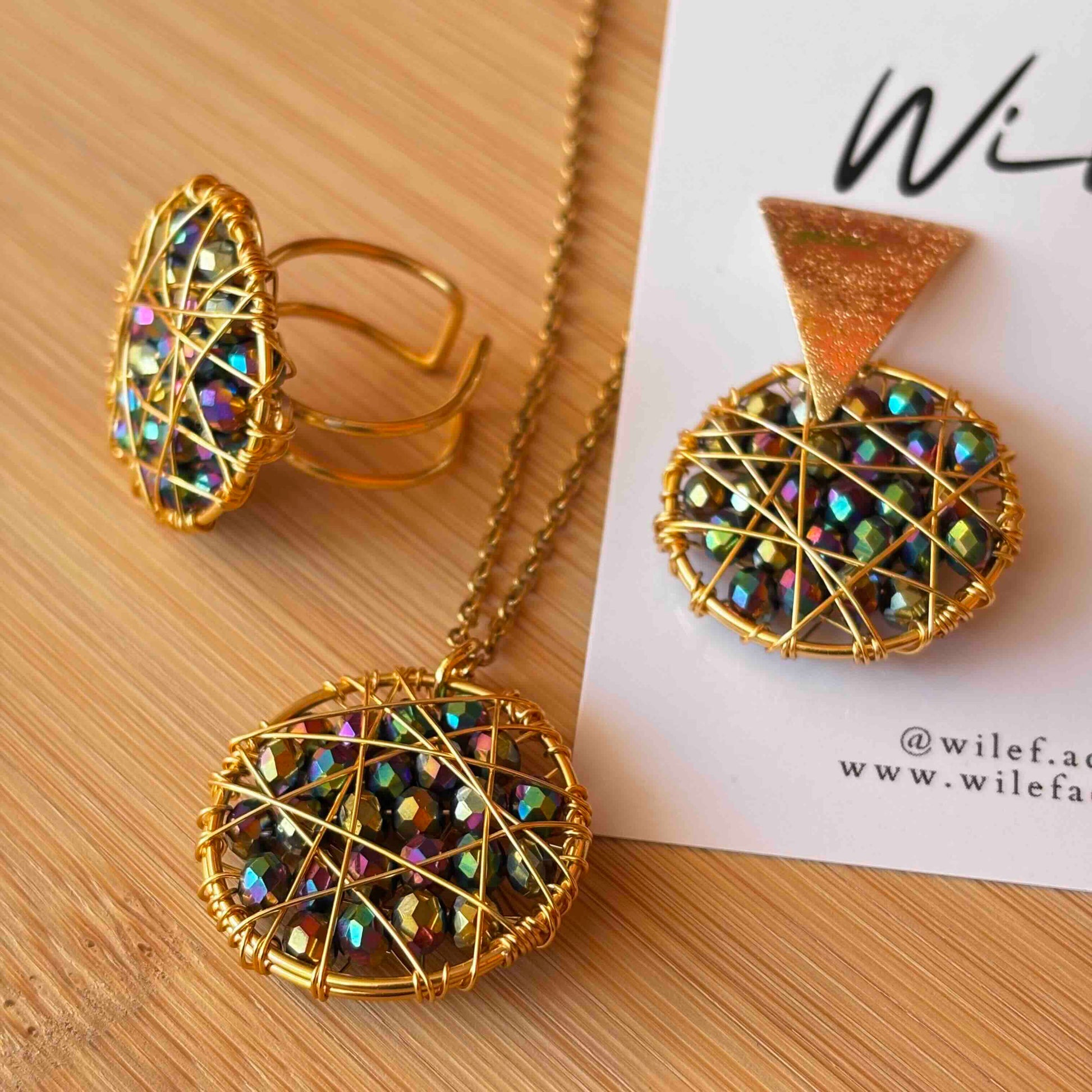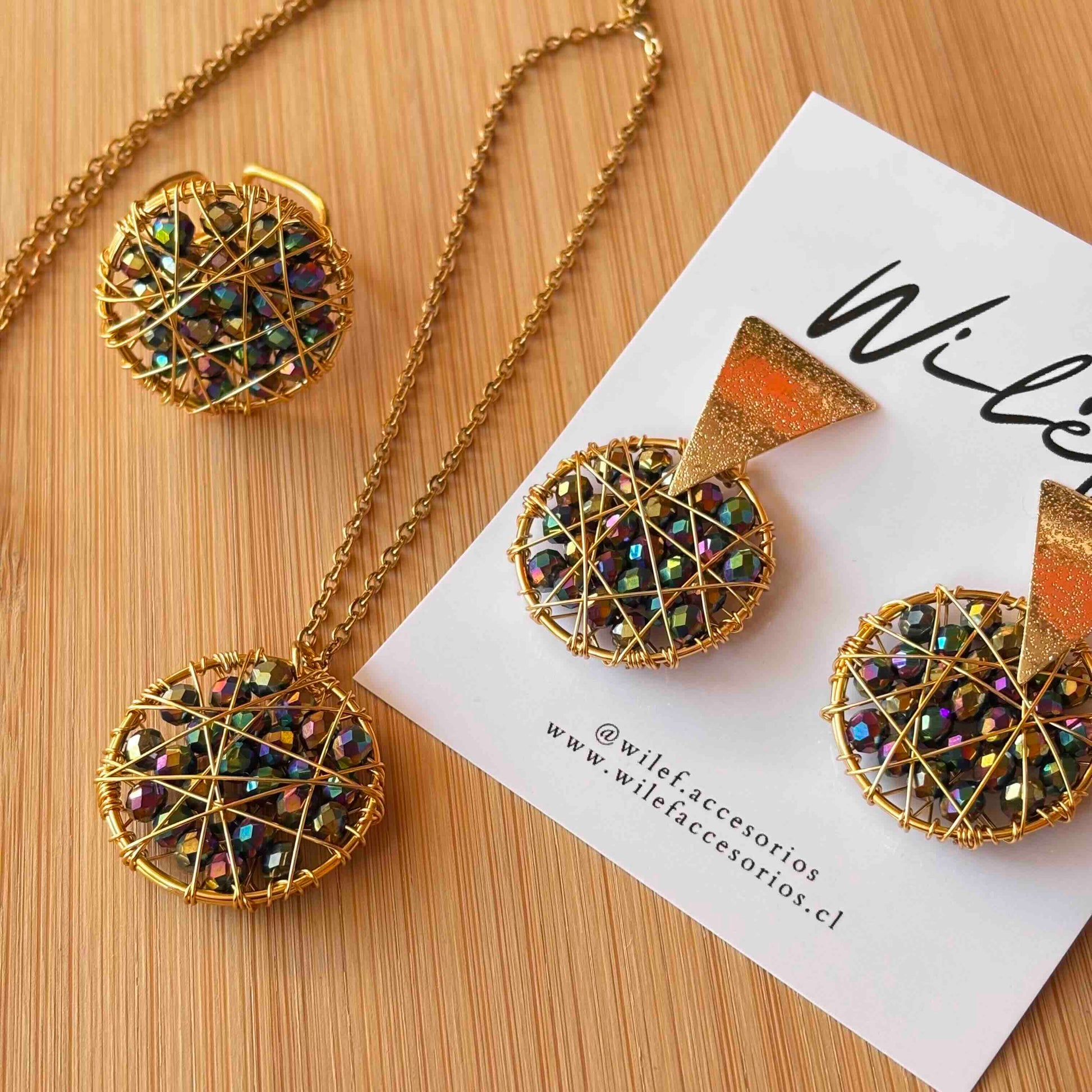 Conjunto Atrapasueño tornasol — Aros, Collar y Anillo Tejidos a Mano en Alambre Dorado con Cristales