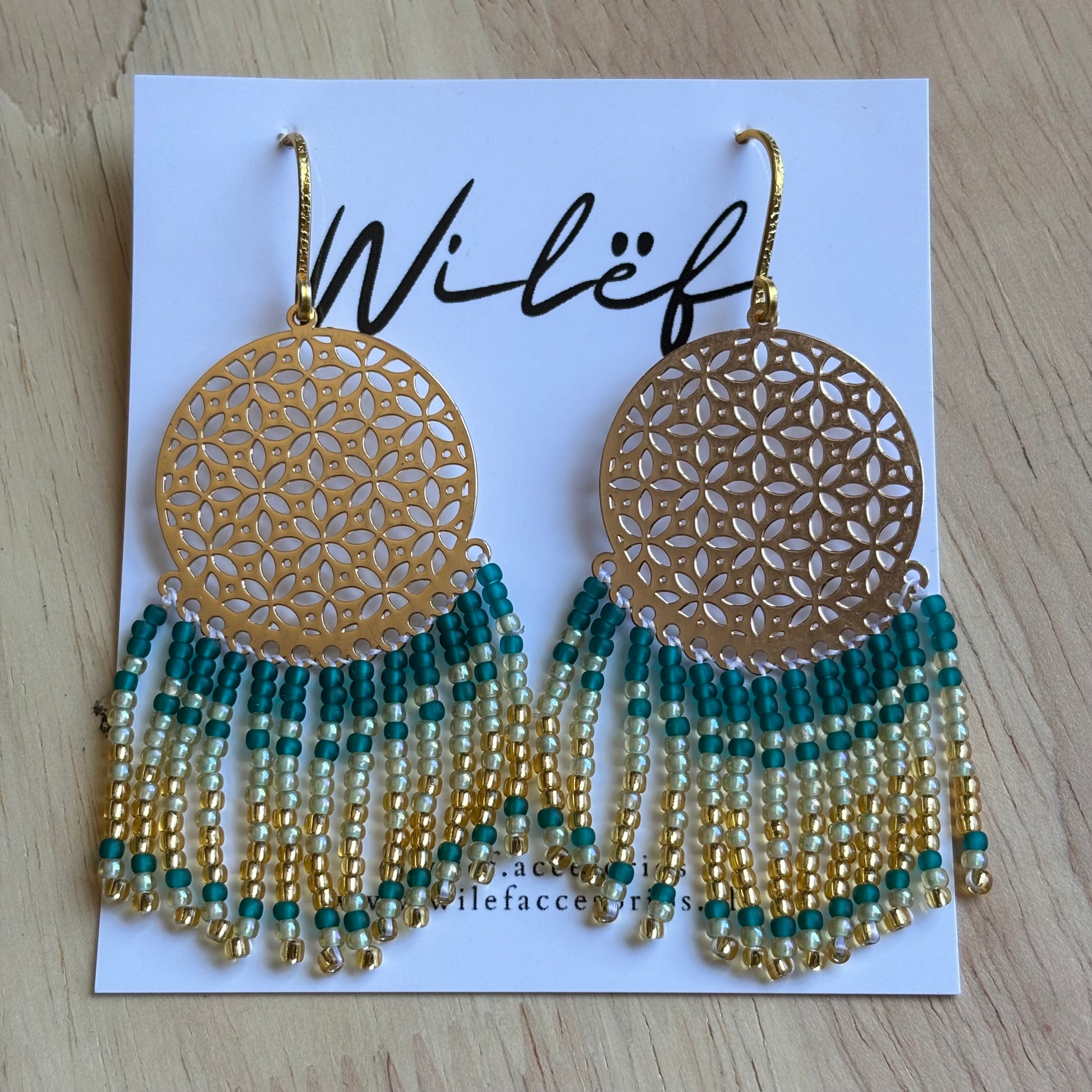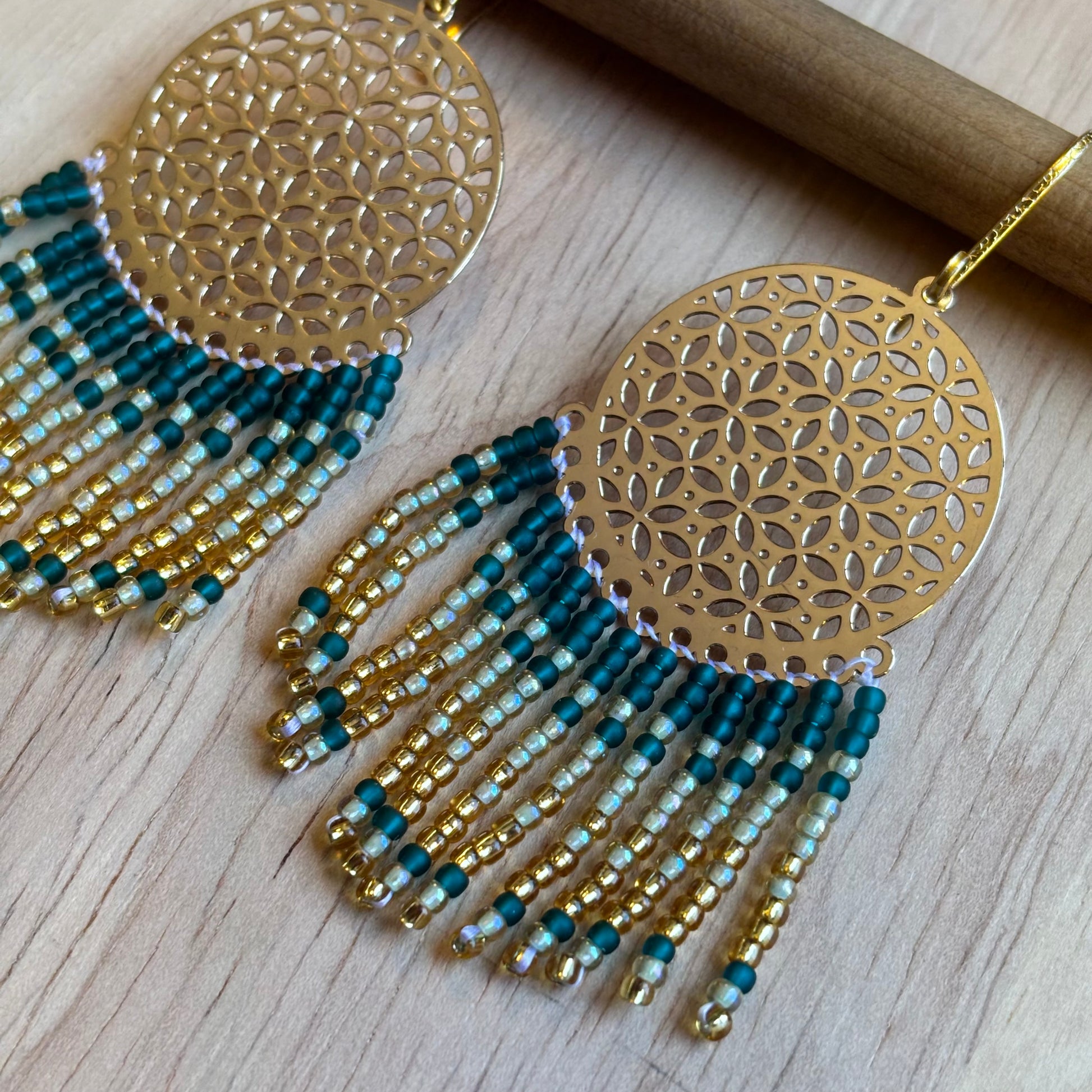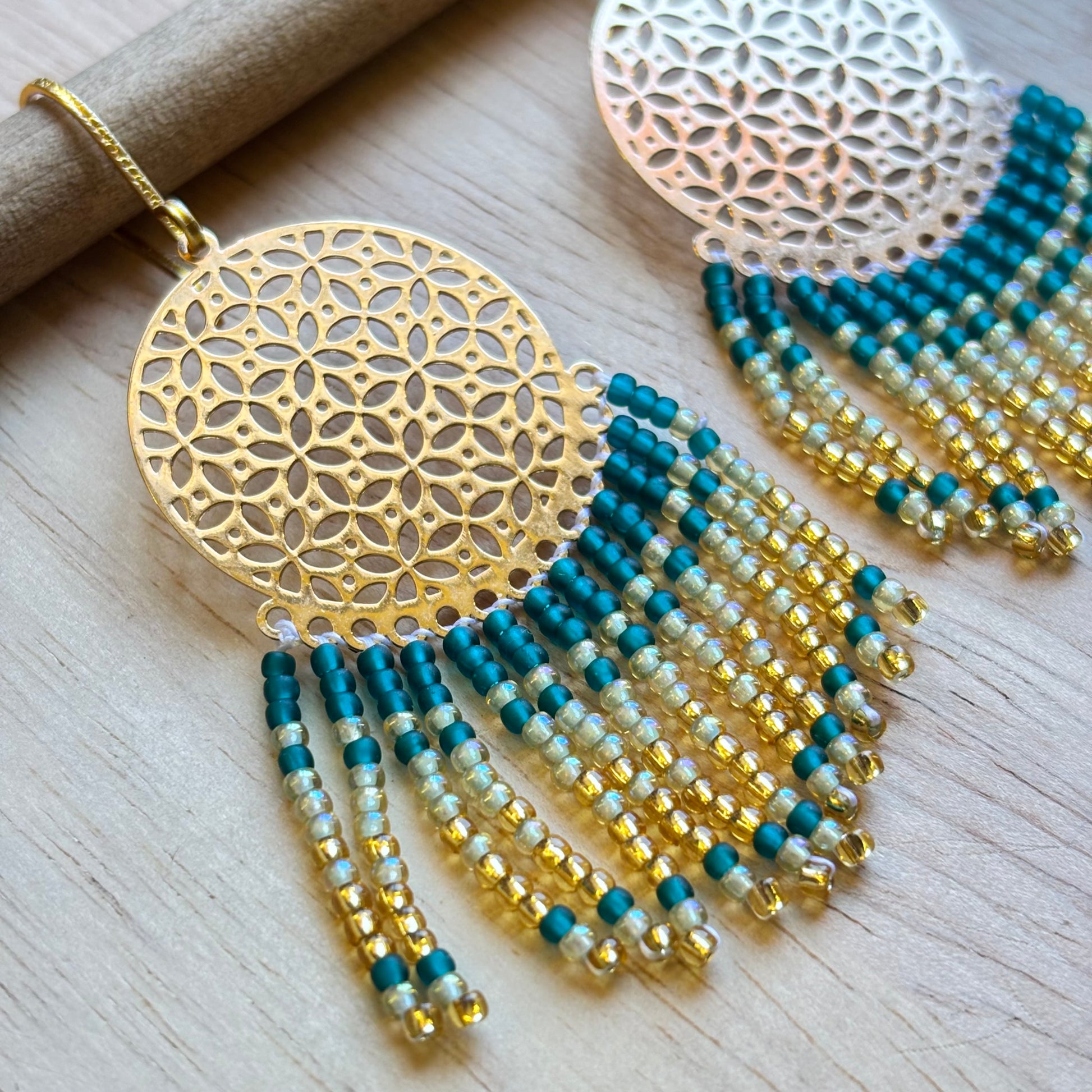 Aros largos con mostacillas – Color Verde Dorado- Diseño Cascada Mandala